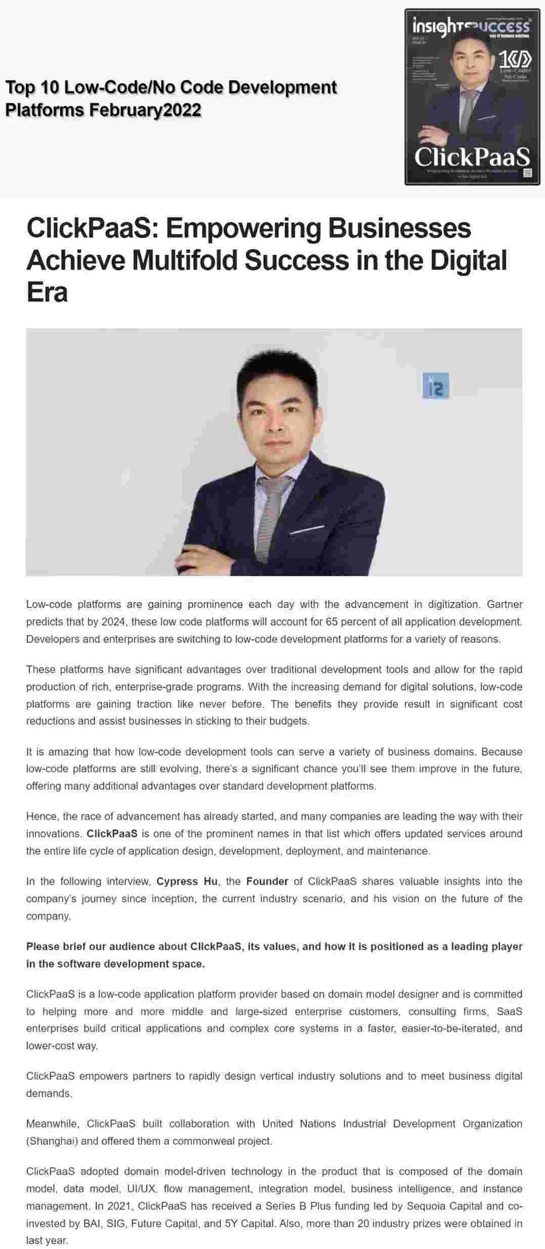 2022年年初,,钱能钱包入选外媒Insights Success低代码/无代码开发平台 Top10,,创始人、、CEO胡柏受邀接受专访并荣登封面人物,,,他与Insights Success的读者分享了钱能钱包成立的初心、、发展历程、、、、当前的行业发展趋势以及他对公司未来的展望。。